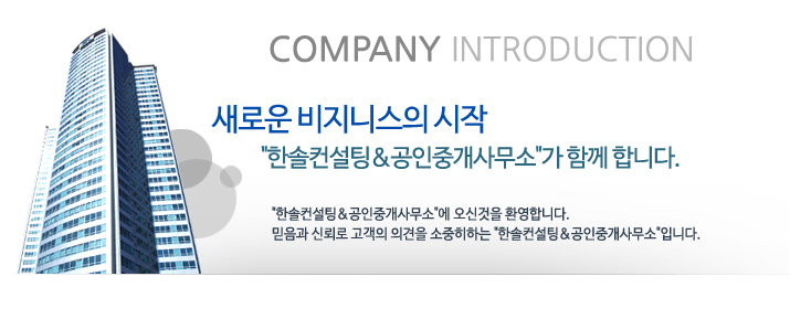 아울러 신뢰를 바탕으로 고객님과 오랜 시간 함께 갈수 있는 "한솔컨설팅 & 공인중개사무소"가 되겠습니다.